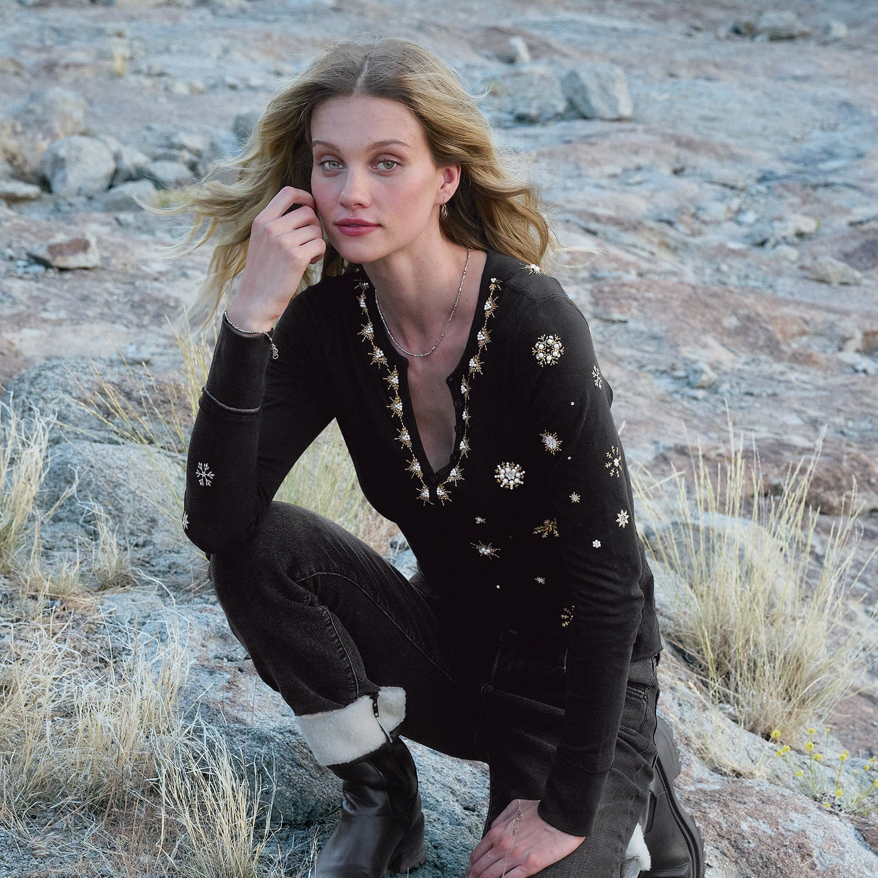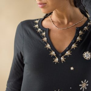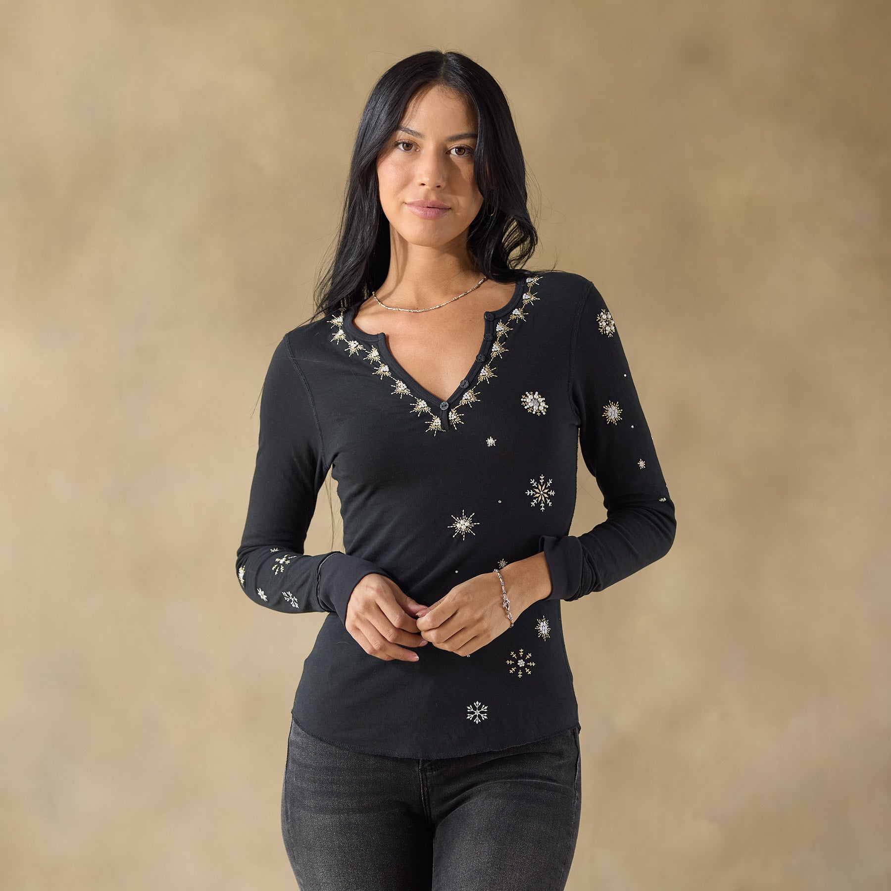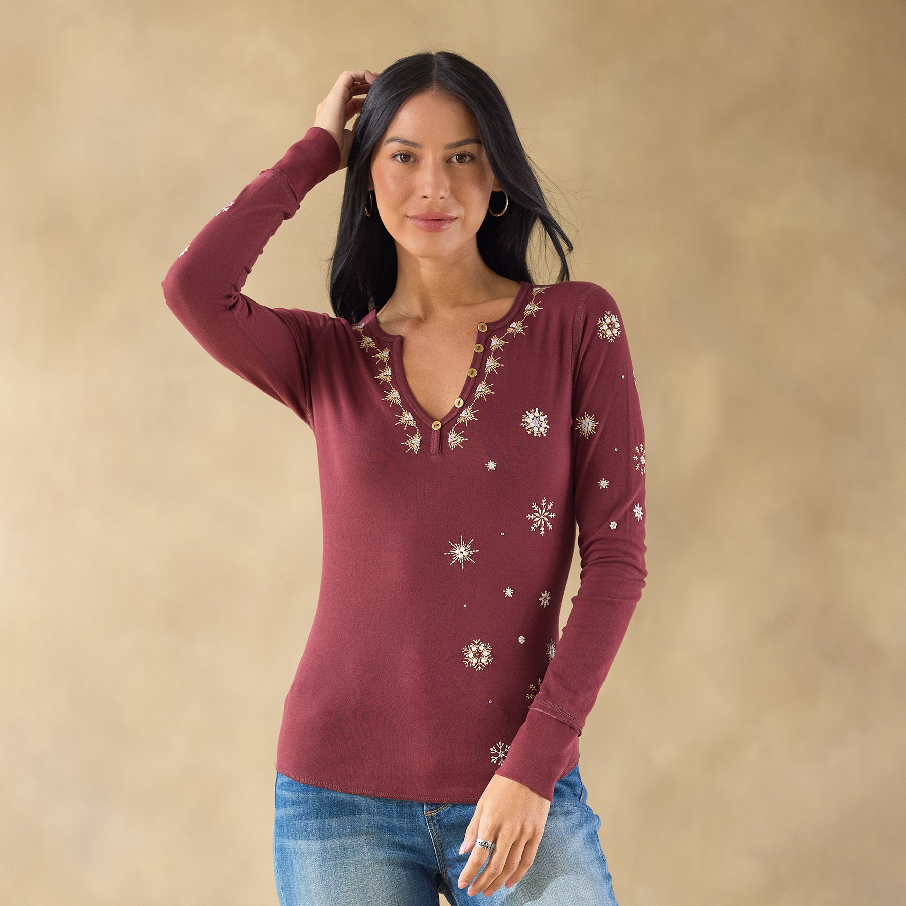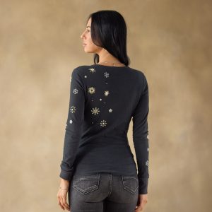 A Sundance favorite. our henley shirt with raw edge details features festive snowflake inspired embroidery. rib trim and buttons at the notch neckline. Cotton/polyester. Machine wash. Imported. Sundance exclusive. Sizes XS (0–2). S (4–6). M (8–10). L (12–14). XL (16–18). XXL (20–22). Approx. 25.5l.