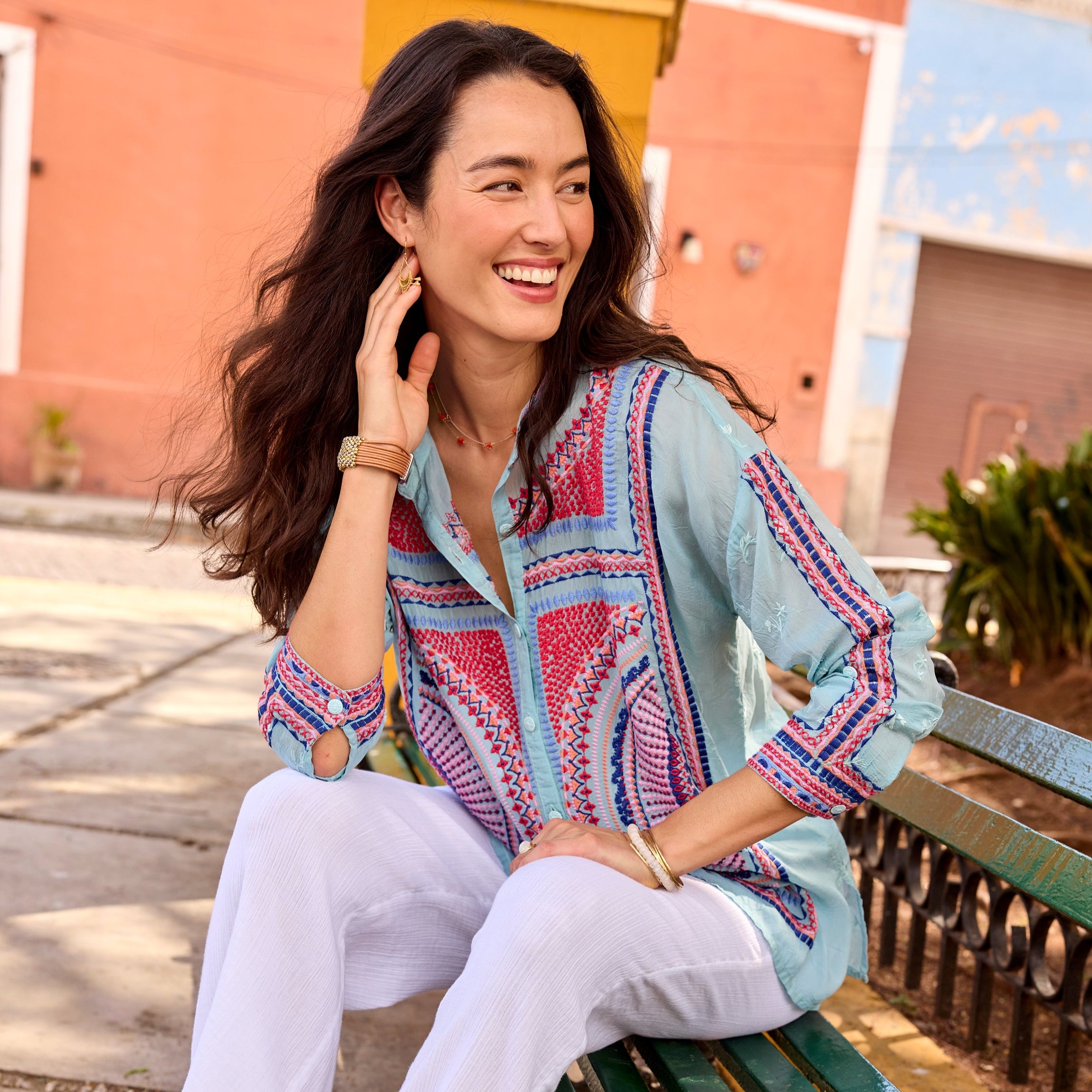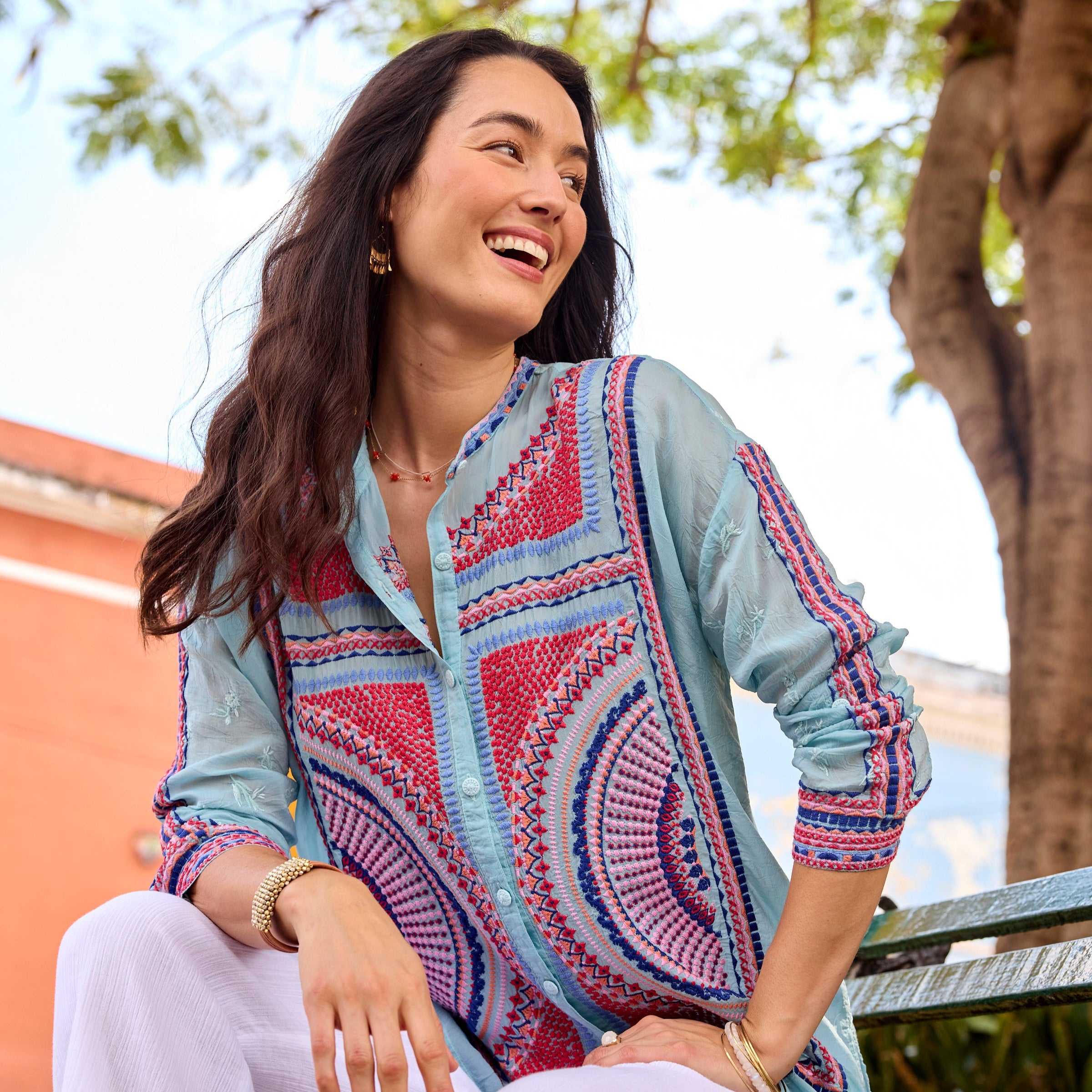 The Audrey Mandarin Collar Shirt from Johnny Was features a mandarin collar and drop-shoulder sleeves with roll-tab cuffs. 100% Cupro. Machine wash. Sizes XS (4) S (6-8). M (8-10). L (12). XL (14). XXL (16)