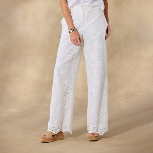 Sporty and feminine. our cotton gauze. eyelet pants are loose and flowing. with wide-leg silhouette. scalloped hem. side seam pockets and back patch pockets. Fully lined. with button closure zip fly and tie at waistline. Machine wash. Imported. Exclusive. Sizes 0–14. 27.5 inseam