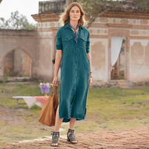 A button-front shirt dress in beautifully flowing Tencel. Two on-seam pockets. two chest pockets. high side slits. roll-tab sleeves. Machine wash. Imported. Sizes XS (0 to 2). S (4 to 6). M (8 to 10). L (12 to 14). XL (16 to 18). Approx. 50-1/2L.