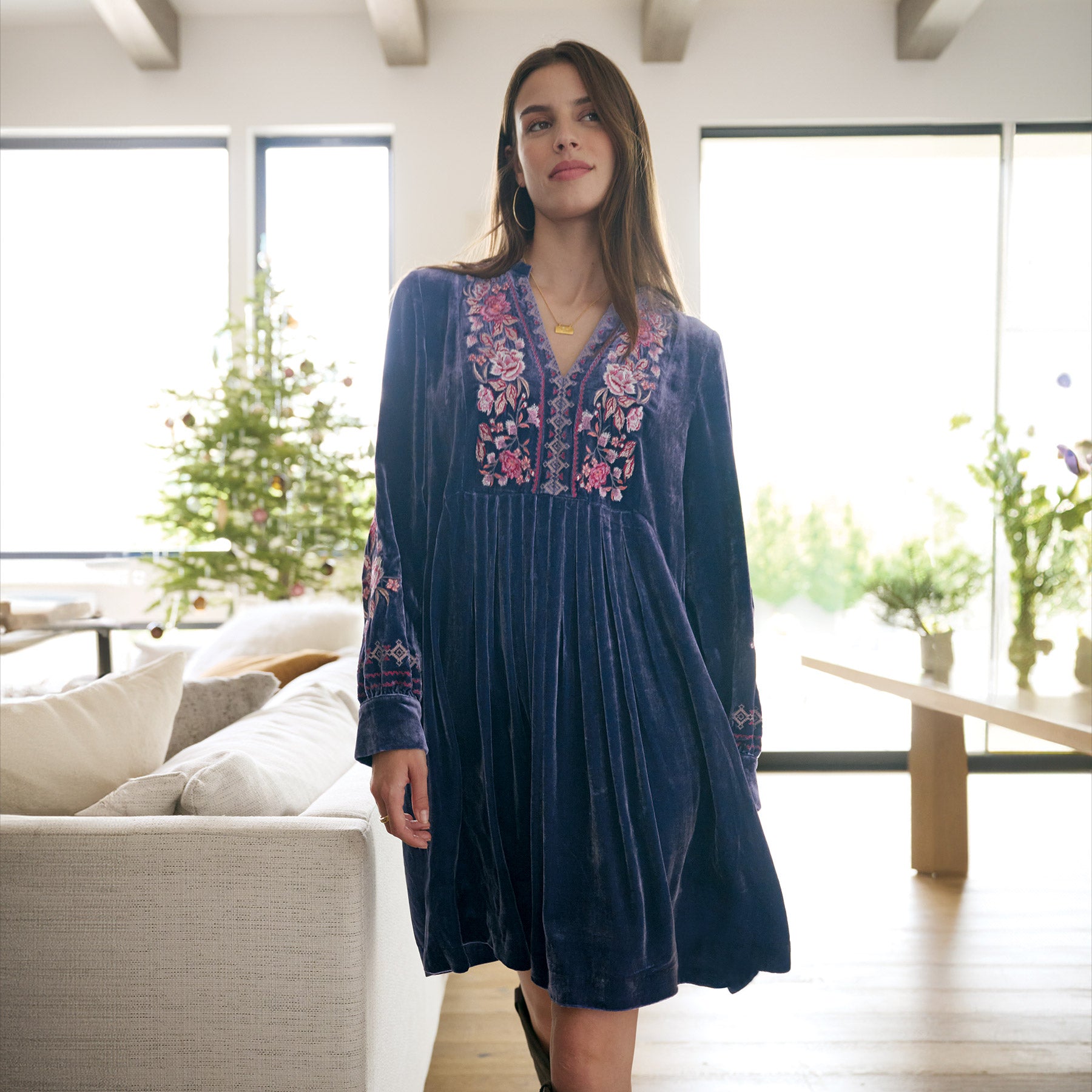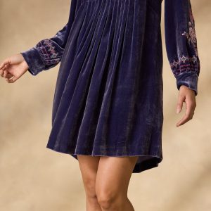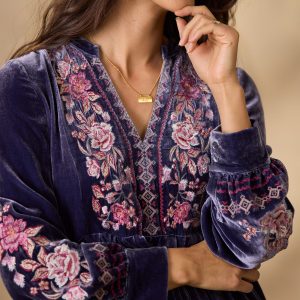 So luxurious. our velvet notch neckline popover dress is blooming with lovely embroidery on the front placket. two side seam pockets and pleating details. Viscose/silk. Dry clean. Imported. Exclusive. Sizes XS (0?C2). S (4?C6). M (8?C10). L (12?C14). XL (16?C18). XXL (20?C22). Approx. 37l.