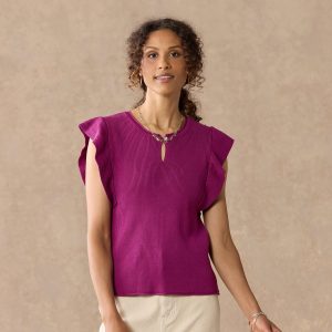 This ribbed cable sweater features a variety of textures. flutter sleeves and a front keyhole with button. Polyester/viscose. Hand wash. Imported. Sizes XS (0?C2). S (4?C6). M (8?C10). L (12?C14). XL (16?C18). Approx. 22l.
