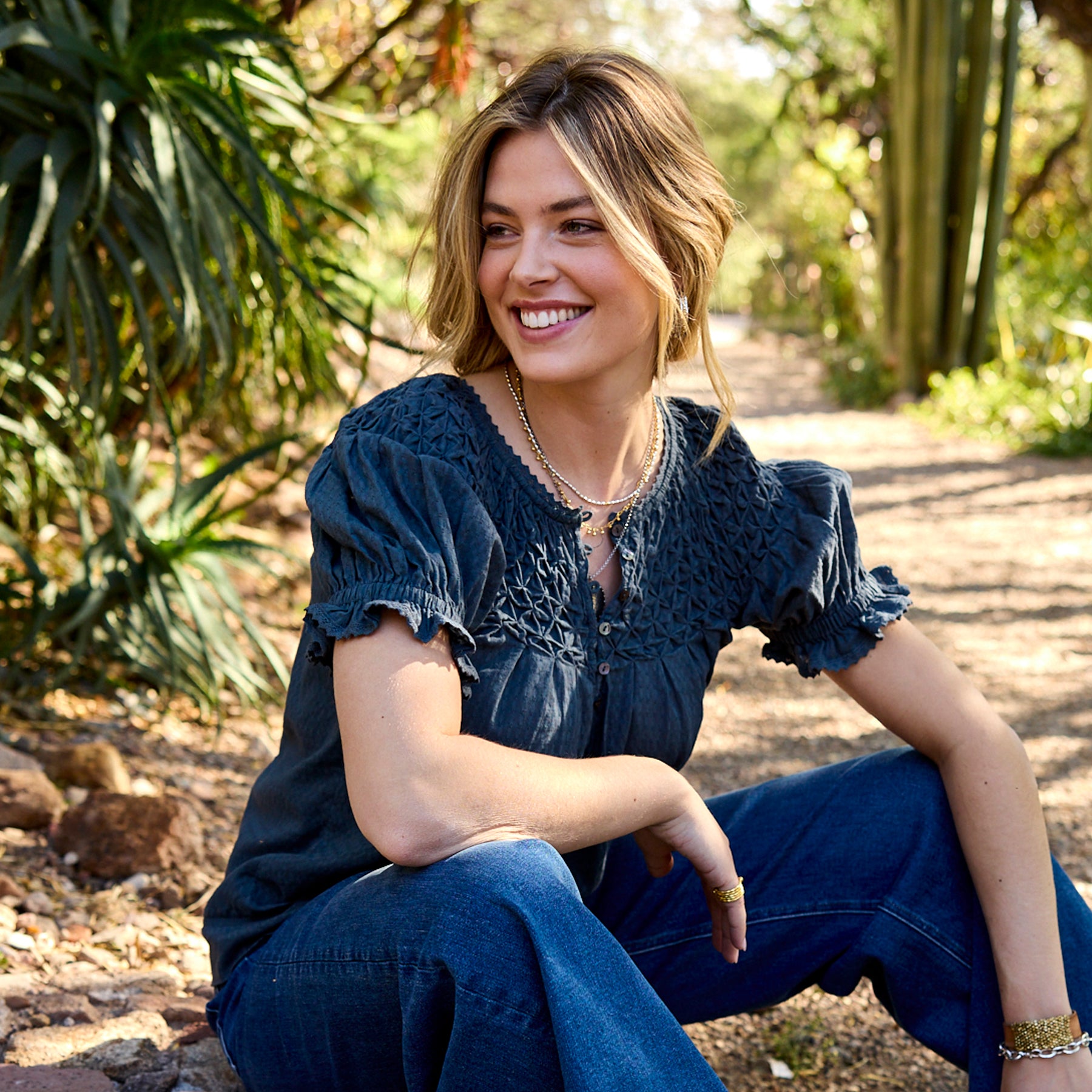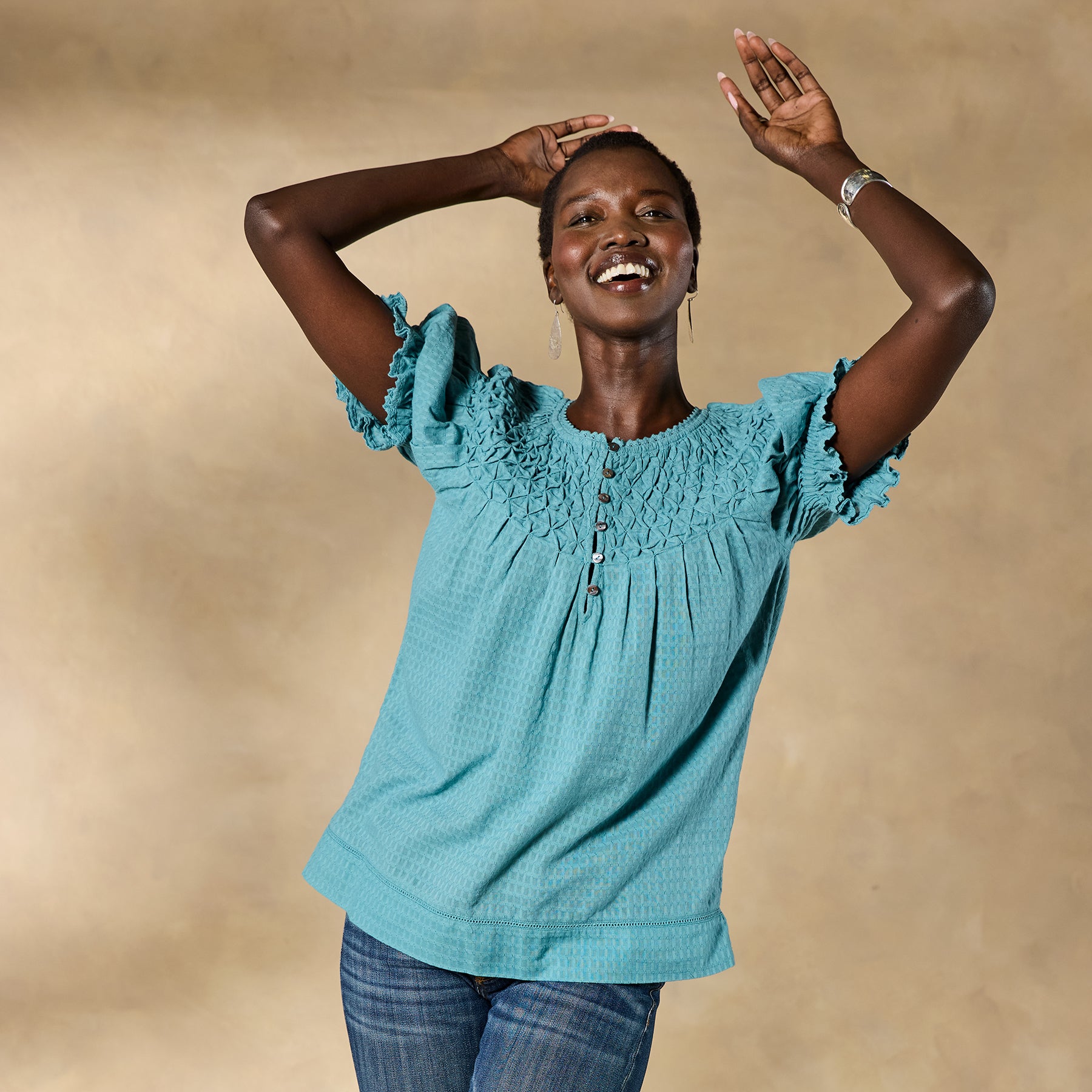 Feminine and textured. our Lodi Top is designed in bold colors with intricate details of lace and pineapple smocking. Button placket with loop closure. Elastic cuffs. Cotton. Machine wash. Imported. Exclusive. Sizes XS (0–2). S (4–6). M (8–10). L (12–14). XL (16–18). XXL (20–22). Approx. 24.5l.