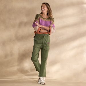 Overflowing with beautiful detail. our asymmetrical floral embroidered cargo pants feature a flattering Hollywood waist with two buttons. five pockets and a straight leg fit. Cotton/lycra. Machine wash. Imported. Exclusive. Sizes 0?C14. 25 inseam.