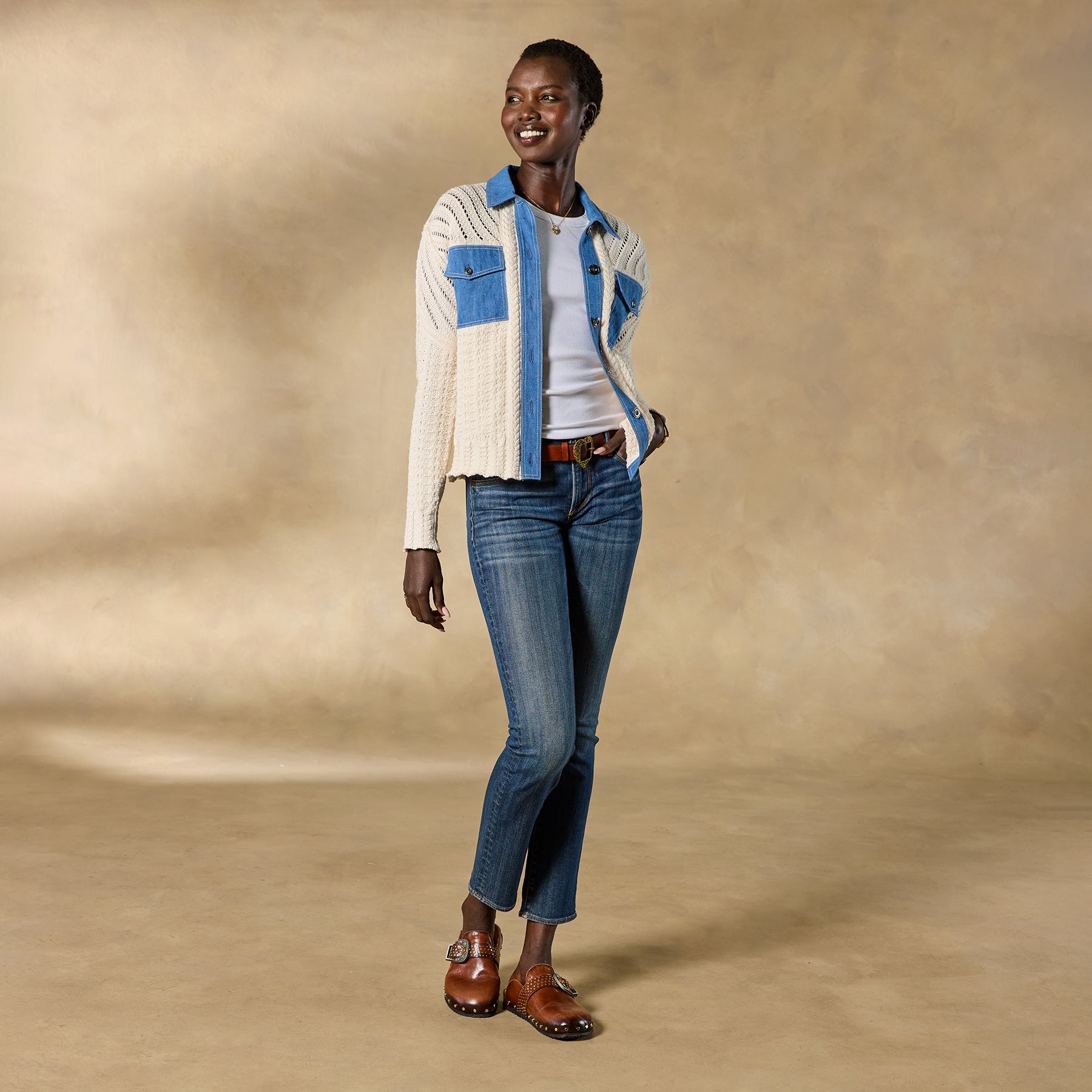 When you can’t decide between a cardigan and a denim jacket. reach for the Mesquite. This stylish mixed-media topper offers the best of both worlds. blending a super-soft sweater with denim accents. Cotton. Hand wash. Imported. Exclusive. Sizes XS (0–2). S (4–6). M (8–10). L (12–14). XL (16–18). XXL (20–22). Approx. 21l.