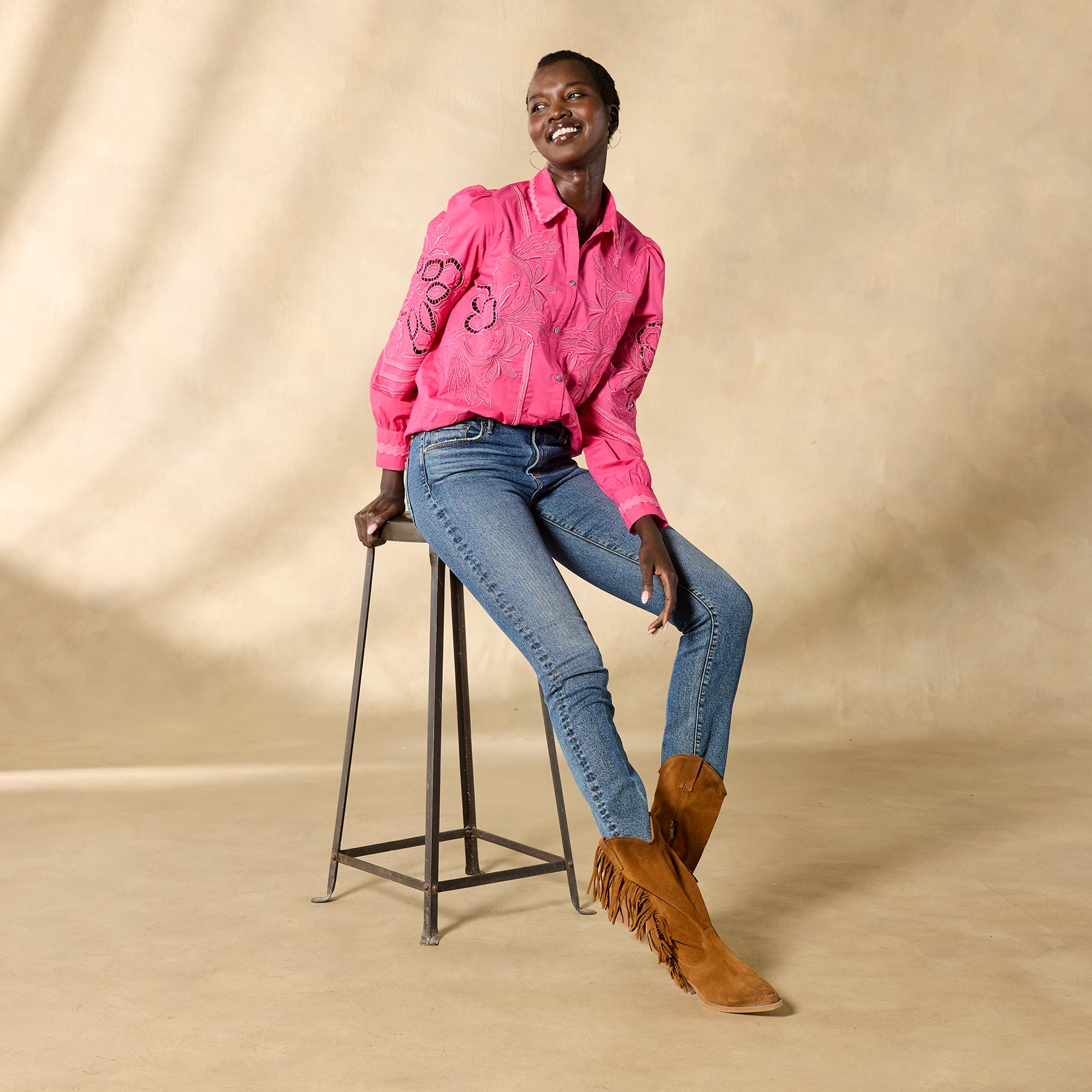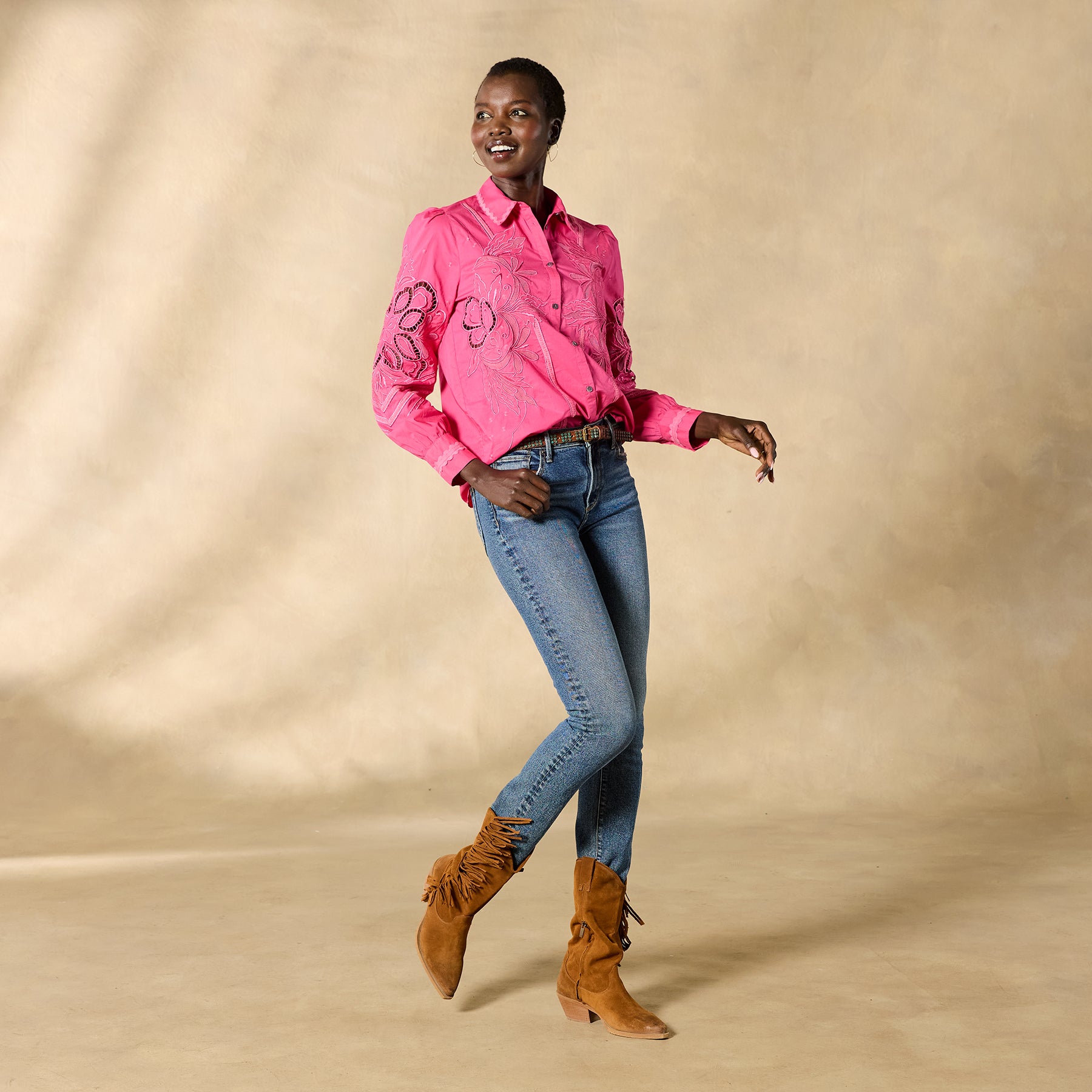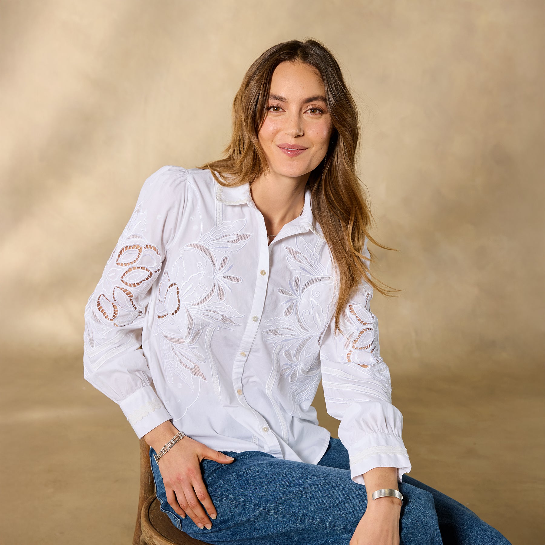Tonal embroidery lends understated elegance to our textured button-down top with novelty trim detail. ladder lace and shirring at the back yoke. Cotton. Hand wash. Imported. Exclusive. Sizes XS (0?C2). S (4?C6). M (8?C10). L (12?C14). XL (16?C18). XXL (20?C22). Approx. 25.5l.