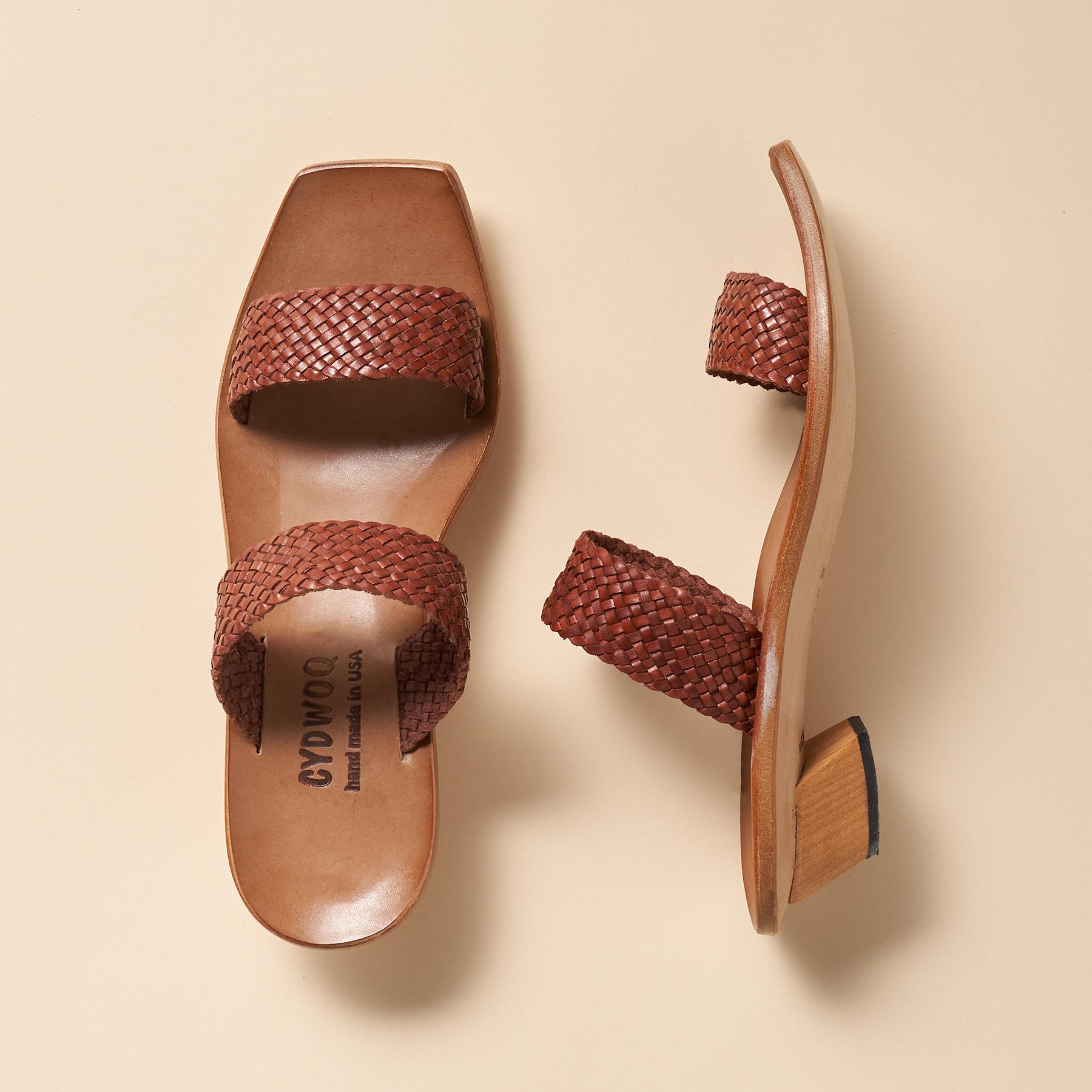 Textured woven leather slip-on sandals with a molded wood footbed and a kitten heel strike a perfect balance between ease and style. Leather. Sizes 36 to 42. 36 (US 6). 37 (US 7). 38 (US 8). 39 (US 9). 40 (US 10). 41 (US 11). 42 (US 12). 1 heel.
