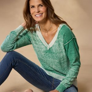 Reverse printed for a casual. faded look. our relaxed-fit sweater boasts an alluring V-neck front and back. exposed seaming details. rib trim and side slits. Subtle hi-lo hem. Cotton. Hand wash. expect dye transfer or loss. Imported. Exclusive. Sizes XXS (00). XS (0–2). S (4–6). M (8–10). L (12–14). XL (16–18). Front approx. 21l.