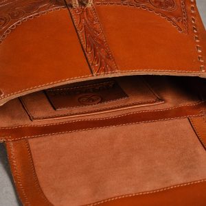 Lush botanical tooling and whipstitching highlight this handcrafted. burnished leather bag. Toggle and leather loop closure. one slot pocket. adjustable strap. Leather. Imported. Approx. 11.5w x 3.5d x 9h.