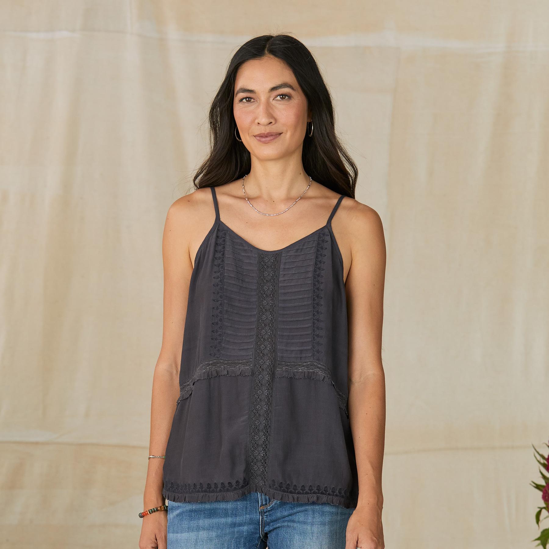 Drawing inspiration from vintage beauty. our lovely camisole is graced with lace insets. pintuck details. tonal embroidery and ruffles. Viscose. Machine wash. Imported. Exclusive. Sizes XS (0-2). S (4-6). M (8-10). L (12-14). XL (16-18). XXL (20-22). Approx. 24.5l.