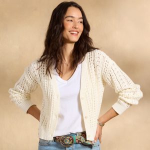 Great to layer over dresses. our feminine. V-neck cardigan is garment dye acid washed. with an open. textural stitch and rib trim. Slightly cropped. Cotton. Hand wash. Imported. Exclusive. Sizes XS (0?C2). S (4?C6). M (8?C10). L (12?C14). XL (16?C18). XXL (20?C22). Approx. 20.5l.