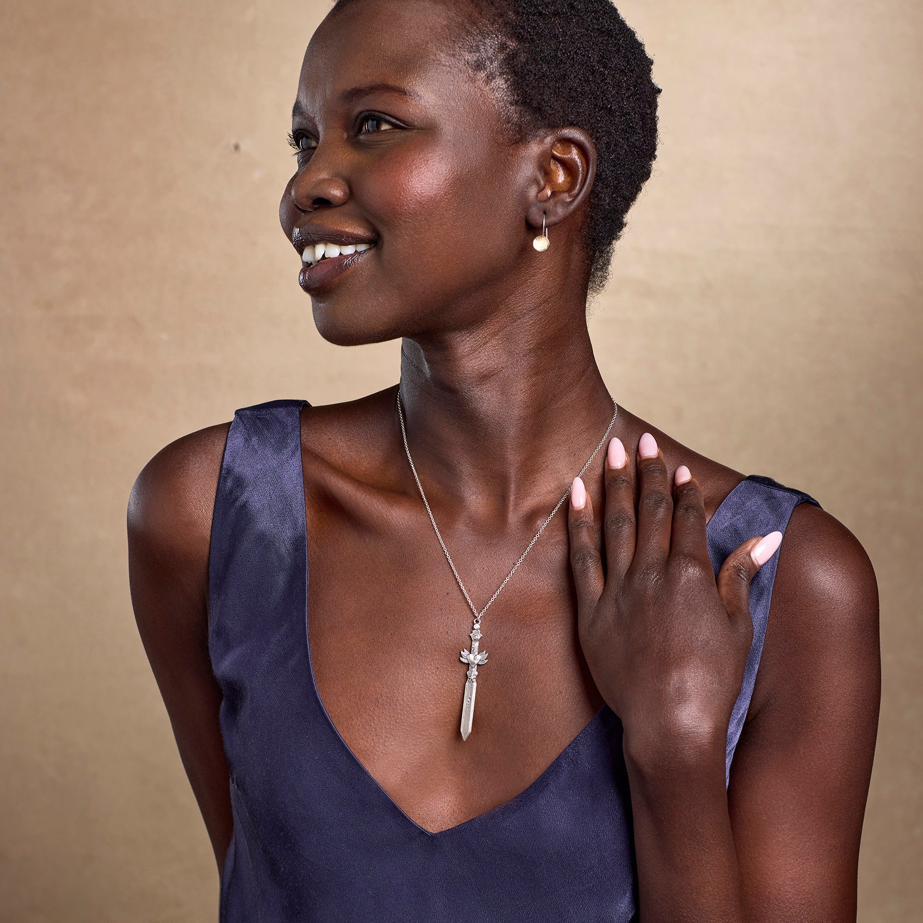 Join Jes MaHarry in her quest for a world where love rules. Her exquisitely detailed necklace culminates in a sword-shaped charm topped by a tiny diamond. Lobster clasp. Handmade in USA. 18l. 2 5/8 drop.